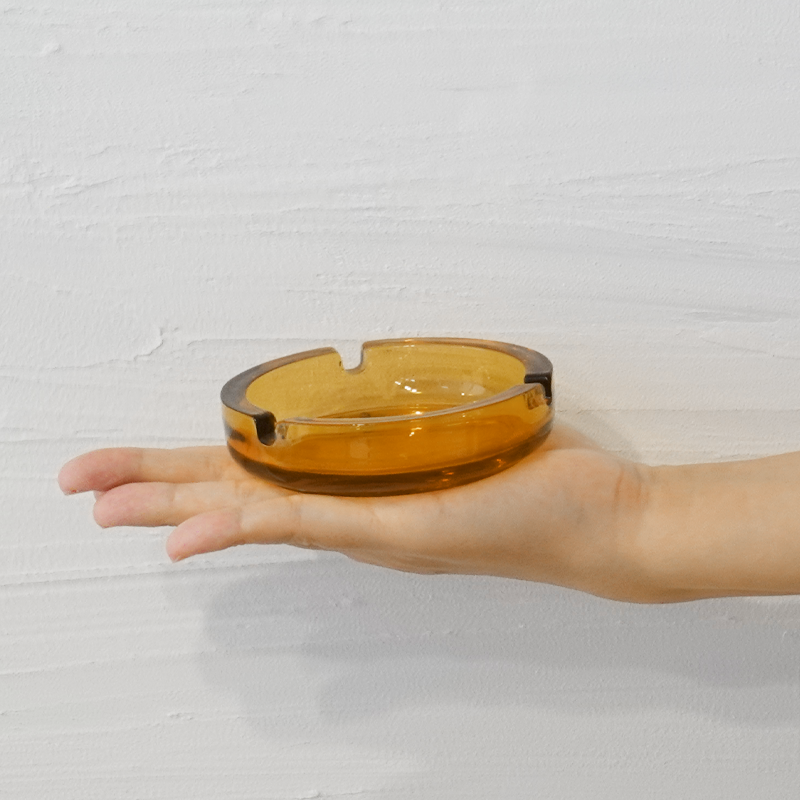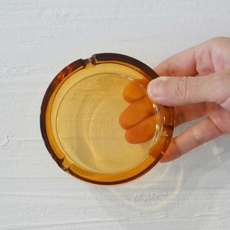 《深みのあるアンバーカラーが印象的な、丸型のガラス灰皿》