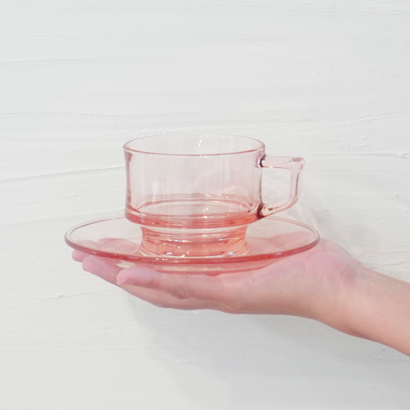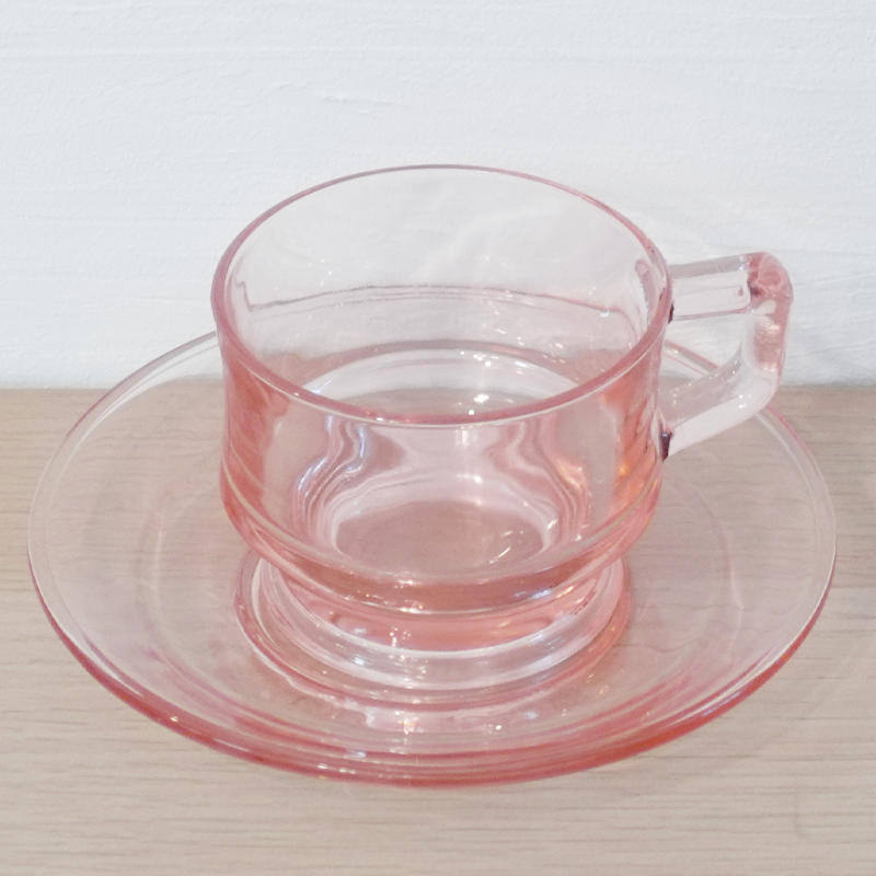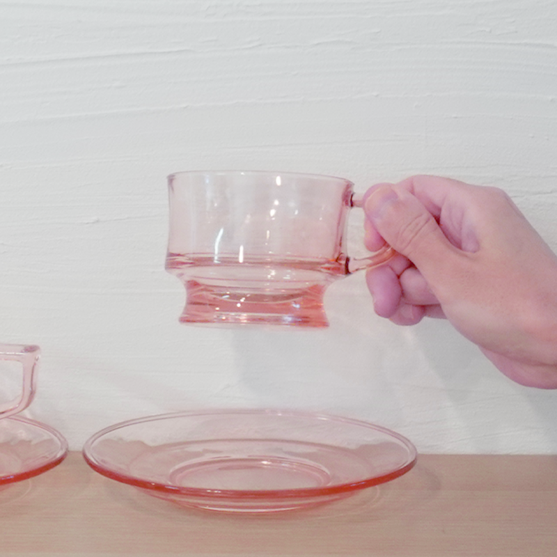 《淡いピンクがやさしく映える、レトロなガラス製のカップ&ソーサー 2客セット》
